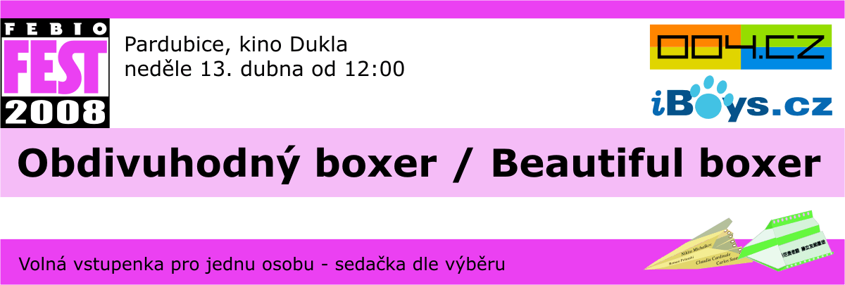 Pardubice, neděle 13. dubna, 12:00, kino Dukla (adresa tady). Pojďte s námi do kina! Pozdravte staré známé a poznejte nové. V rámci pardubické části Febiofestu shlédnete film Obdivuhodný boxer z cyklu Jiný břeh, na který si zde můžete vytisknout volnou vstupenku. Zároveň budou k dispozici všechny tiskové materiály Code004 a návštěvou nás poctí i zakladatel Febiofestu, pan Fero Fenič.